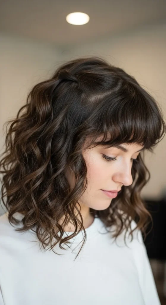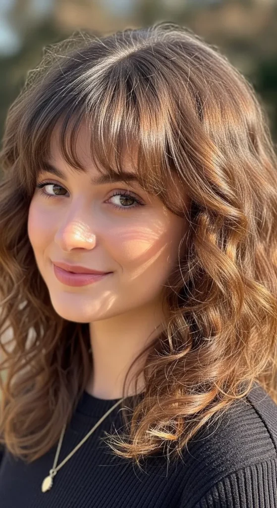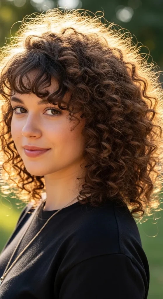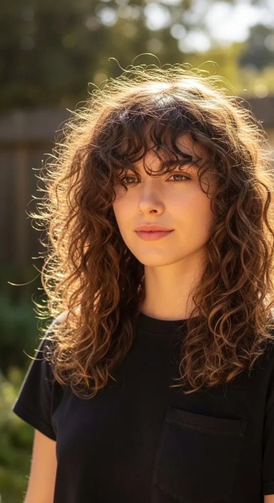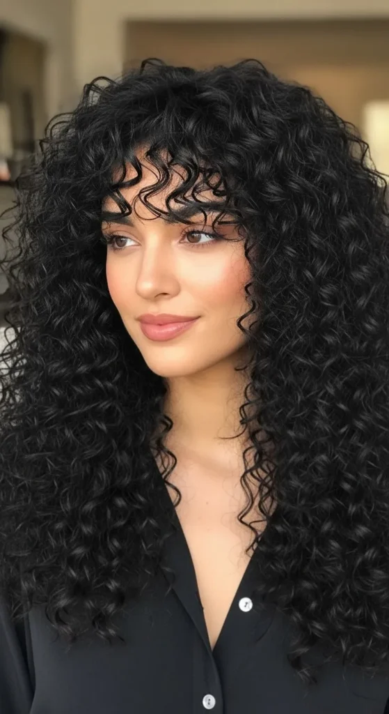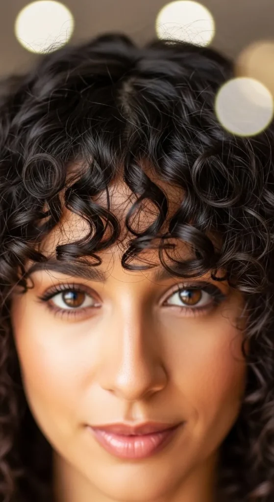 Layered curly bangs add bounce and volume. Trim in soft layers to avoid heaviness. Scrunch hair while drying. This look is great for medium and long hair. It reduces flatness and keeps curls lively. Maintenance is simple and budget-friendly.