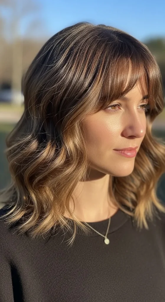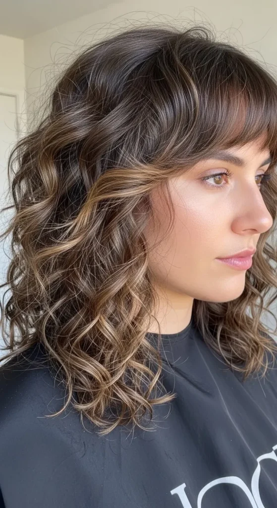 Subtle highlights add depth to curly bangs. Use color-safe shampoo to maintain shine. Apply curl cream for definition. DIY kits can be used carefully at home. This style makes curls look brighter and fuller.