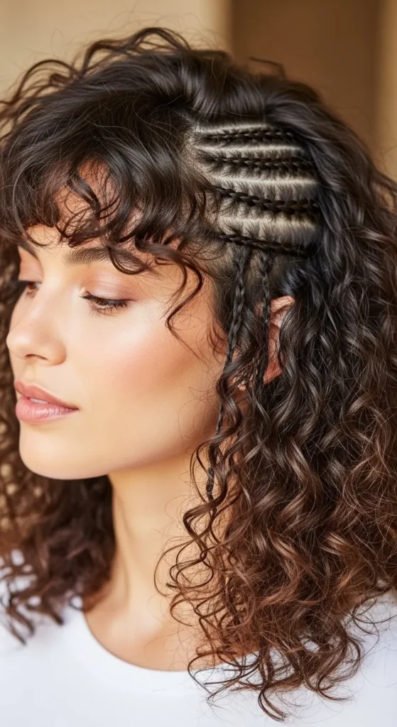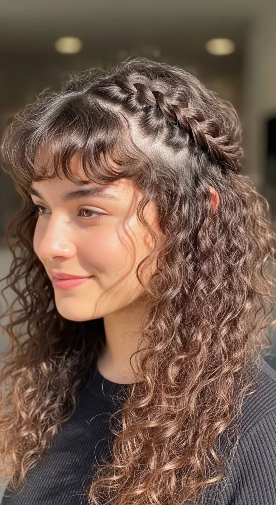 Braid small sections along the top and leave bangs free. Keep curls soft. This creates a romantic and creative look with little effort.