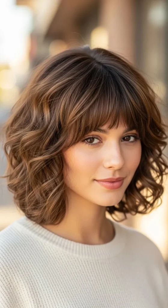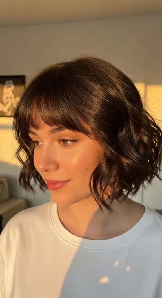 A curly bob with bangs looks bold and playful. Keep bangs slightly longer. Use cream and diffuse. This style is low-maintenance and stylish.