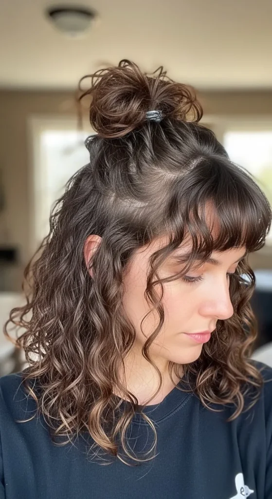 Pull the top half into a bun or clip. Leave bangs free. This keeps hair off your face while showing curls. Great for busy days.