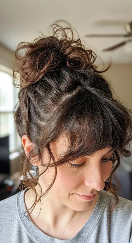 Tie hair into a loose top knot. Let bangs fall naturally. Scrunch for texture. This look is practical and trendy.