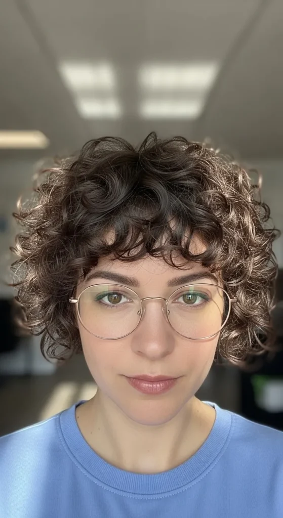 Short curly fringes sit above the eyebrows and create a bold look. Use a small amount of gel or cream for shape. Let curls dry naturally. This style requires little daily effort. It brings focus to your eyes and adds a youthful feel. It works well with layered or long hair.
