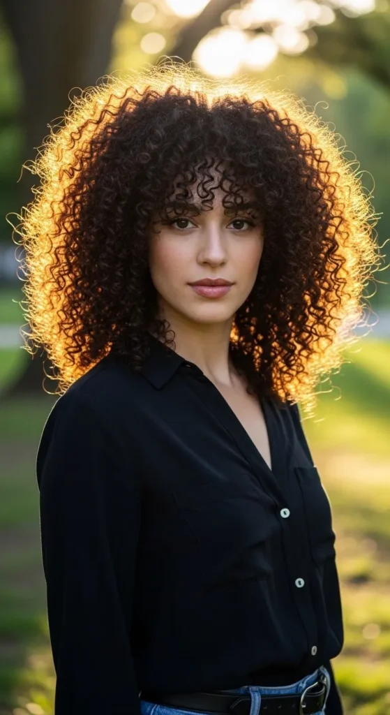 High-volume curly bangs create a dramatic effect. Use volumizing mousse and diffuse upside down. Rollers can add lift without heat. Avoid heavy products. This style works well for events and days when you want extra flair.