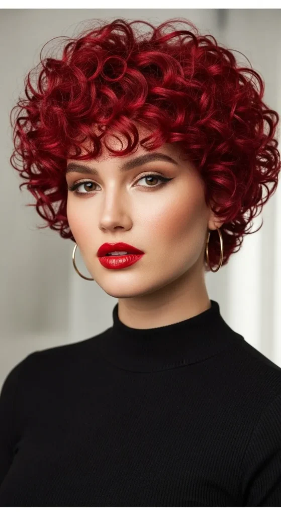 Bright red curls grab attention instantly. Choose a red shade that suits your skin tone. Use color-safe shampoo. Deep condition weekly. Limit heat tools. Trim regularly to keep edges sharp. This style shows confidence and strong personality.
