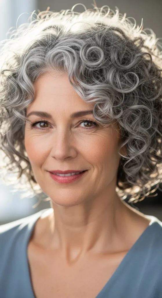 A short pixie makes gray curls shine beautifully. Keep hair moisturized with leave-in conditioner. Use silver shampoo to prevent dull tones. Trim regularly to keep the shape neat. Skipping dye saves money and time. It is bold at any age.