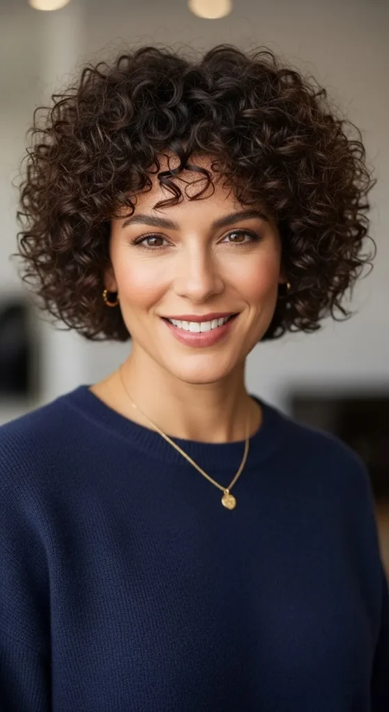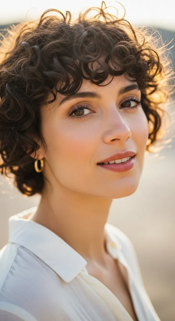 A curly fringe softens the face. Keep it slightly longer than micro bangs. Finger coil for shape. Trim slowly when dry. Use light cream. It feels playful and modern.