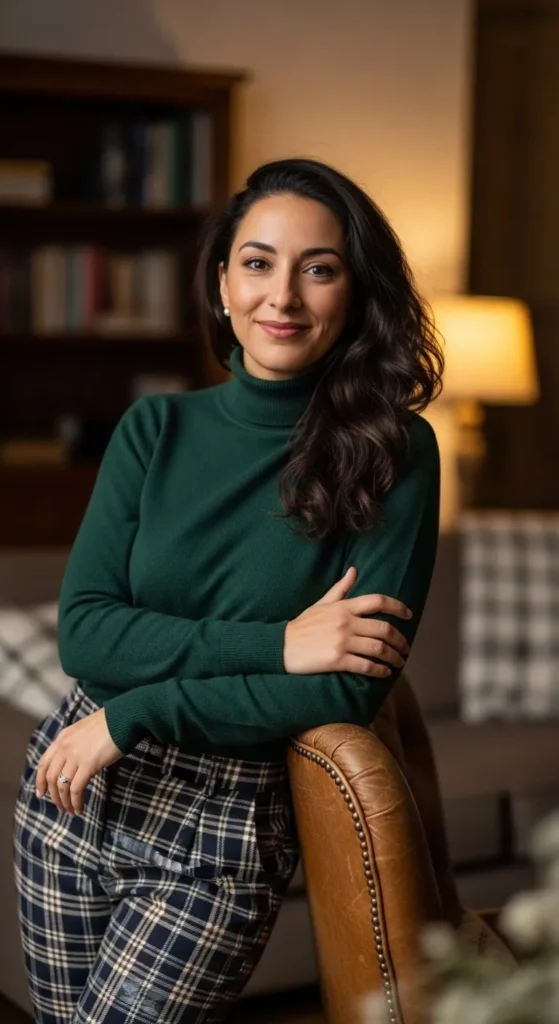 A turtleneck and plaid pants feel warm and smart. Look for soft cotton blends. Tuck in the top. Add a belt. Wear boots or loafers. Stretch tight necklines gently after washing. This mixes patterns and solids well.