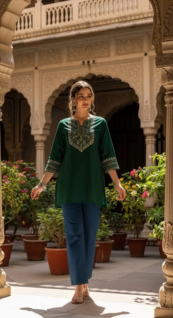 A dark green kurti with white or cream pants feels graceful and practical. Choose breathable fabric. Keep accessories simple. Wear flat sandals. Adjust hems if needed. Wash separately first time. This fits traditional and modern styles.