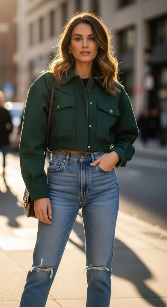13. Green Crop Jacket With High-Waist Jeans
