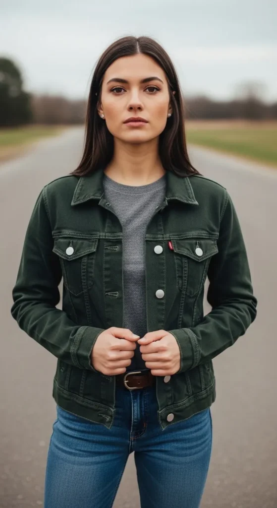 A green denim jacket works year-round. Layer over dresses or jeans. Check stitching before buying. Add patches for DIY style. Spot clean often. Wash rarely. A strong everyday piece.