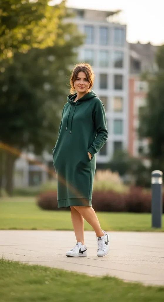 A hoodie dress feels cozy. Wear with leggings. Choose thick fabric. Add sneakers and crossbody bag. Wash gently. Great for relaxed days.