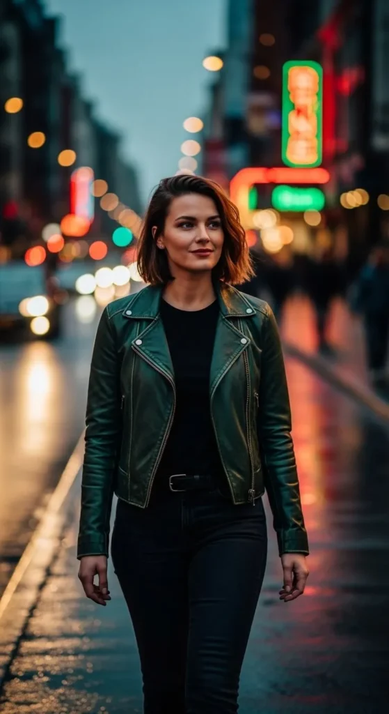 A green leather jacket adds bold style. Faux leather saves money. Pair with black jeans. Keep rest simple. Clean with damp cloth. Adds character fast.
