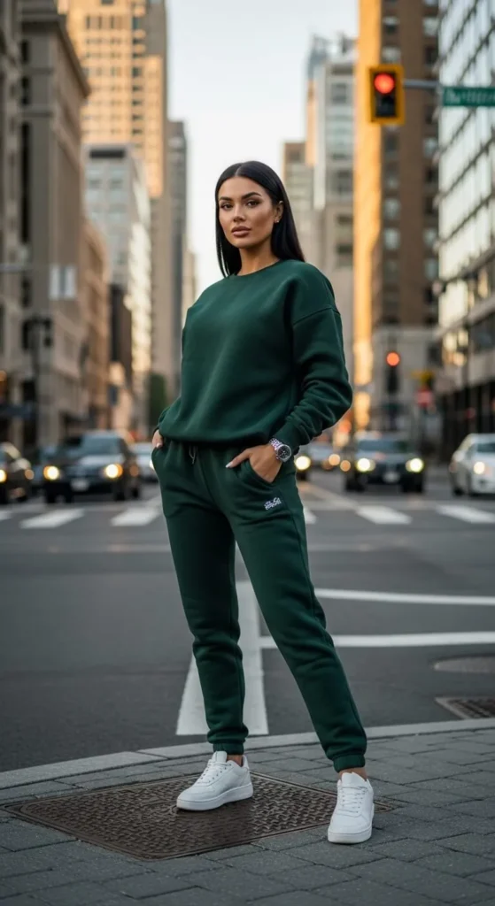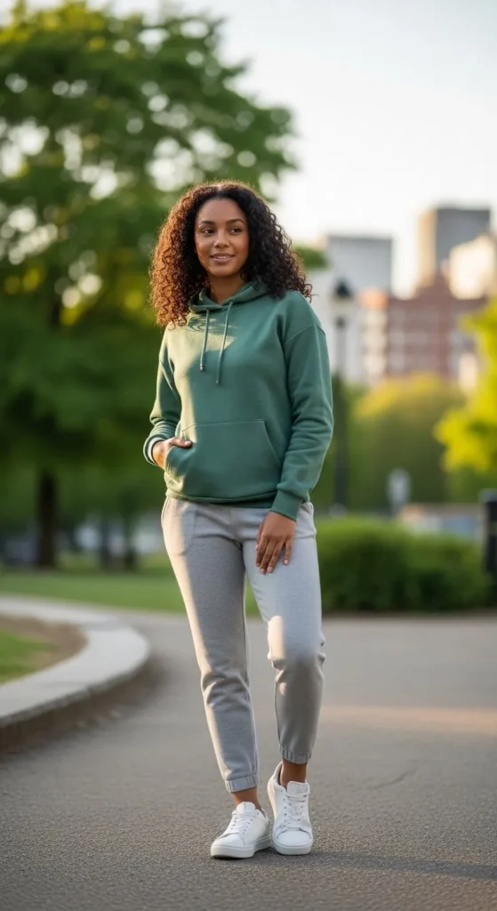A forest green hoodie and gray joggers create a relaxed but neat look. Choose hoodies with thick fabric and strong seams. Gray joggers match almost everything. Wash them in cold water to reduce fading. Pair with clean sneakers. Add a crossbody bag for daily use. Layer a white t-shirt underneath for structure. Tuck part of the hoodie into the waistband if it feels oversized. Comfort and style can work together.