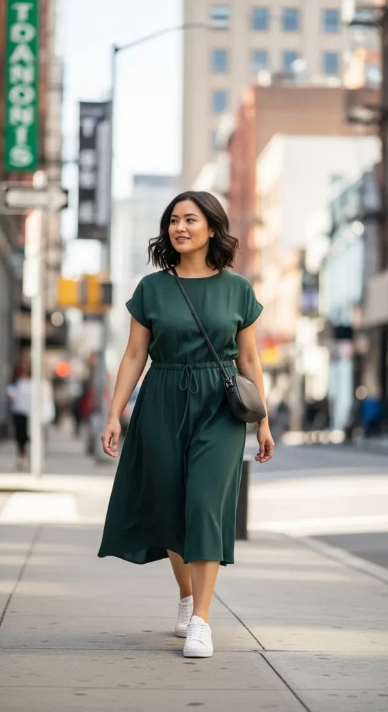 A dark green midi dress with white sneakers mixes comfort and style. It works for shopping, travel, and casual events. Cotton or jersey dresses are easy to maintain. Clean sneakers using baking soda and water. This keeps them looking fresh. Add a thin belt if the dress feels loose. Layer a denim jacket for cool weather. If the dress is too long, shorten it with basic hand stitching. Carry a simple tote bag. This outfit shows dresses can feel relaxed and practical.