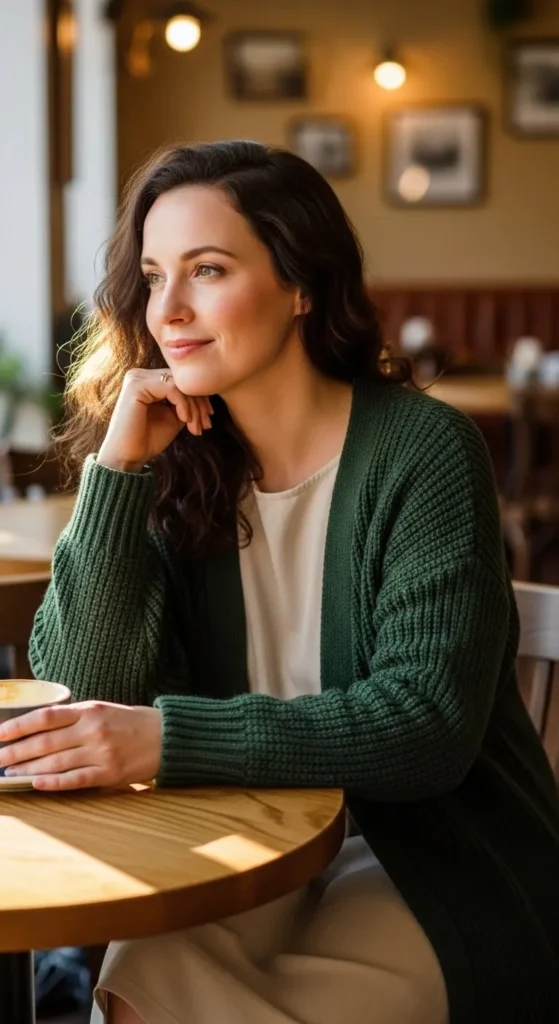 A dark green cardigan over a beige or gray dress feels soft and wearable. It suits work, visits, and casual dinners. Pick cardigans with tight knitting. Button the middle for shape. Add flats or sandals. Remove lint with a razor if fabric pills. Layer with tights in winter. This look helps stretch your wardrobe.
