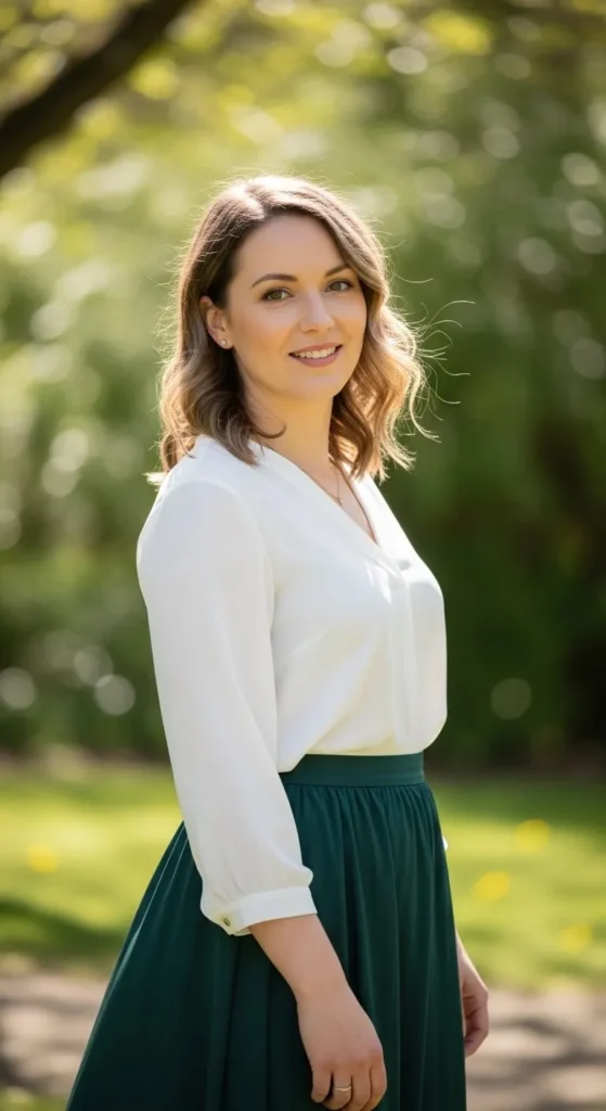 A dark green skirt and white blouse feel clean and classic. This suits offices and formal events. Choose lined skirts. Steam the blouse using shower steam if needed. Tuck it neatly. Wear flats or low heels. Sew elastic into the waistband if loose. Contrast makes this outfit stand out.