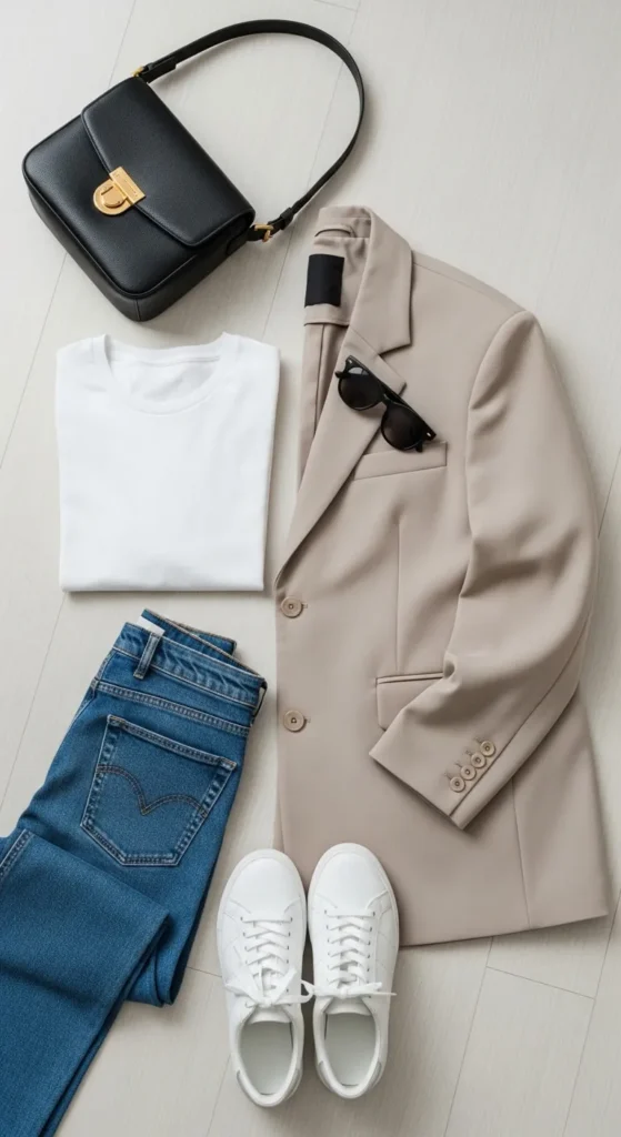 Keep it relaxed but neat. Choose clean sneakers, well-fitted jeans, a soft sweater or tee, and a crossbody bag.