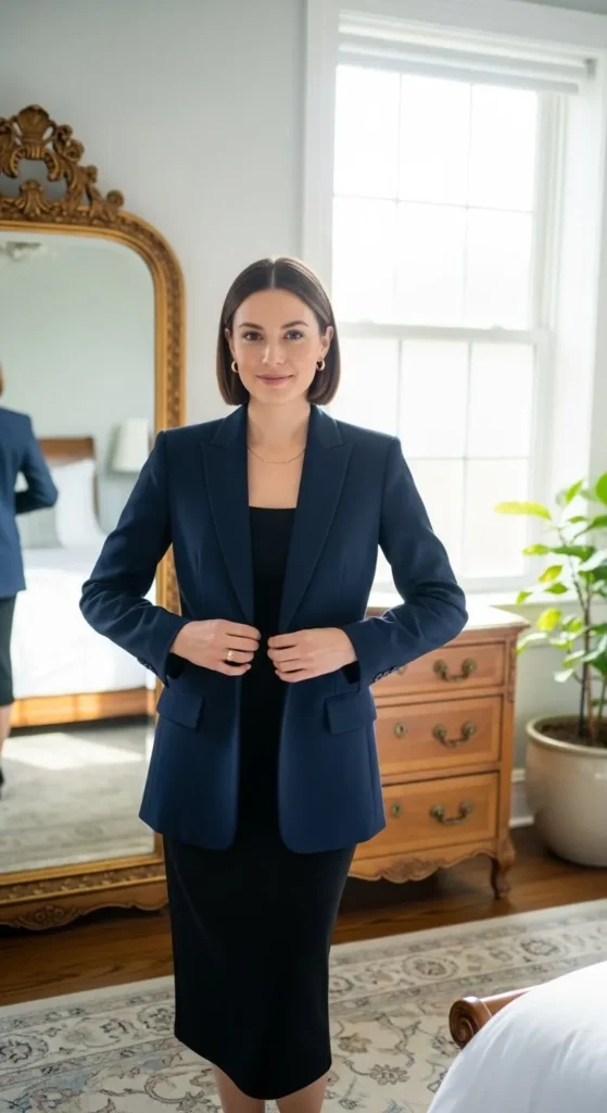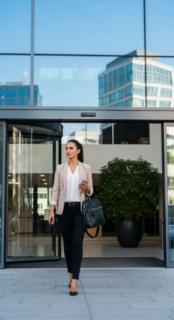 Look professional and confident. Try a blazer, neutral trousers, closed shoes, and simple jewelry.