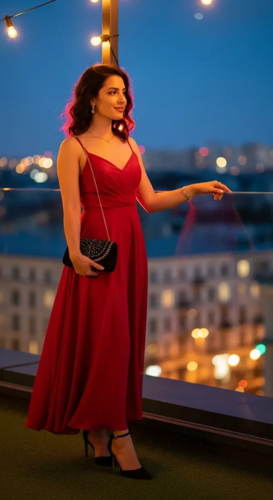 Add a touch of drama. Wear a statement dress or top, heels or stylish boots, bold lipstick, and a clutch bag.