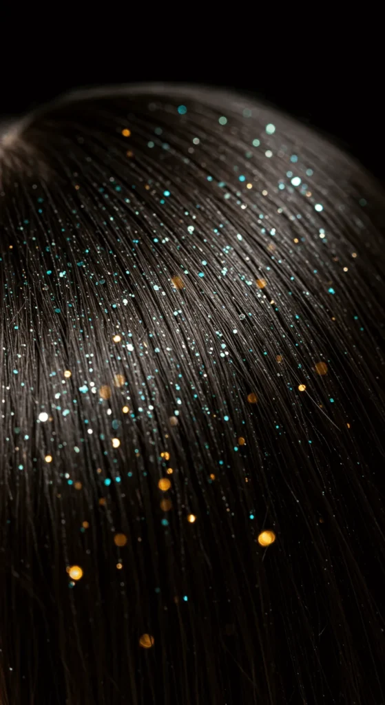 For a fun and bold twist, add glitter to your roots. Mix hair gel with fine cosmetic glitter and dab it along your part line. It works best with buns or ponytails. Use eco-friendly glitter to stay safe for your scalp and the planet. It’s a showstopper idea for New Year’s Eve parties.