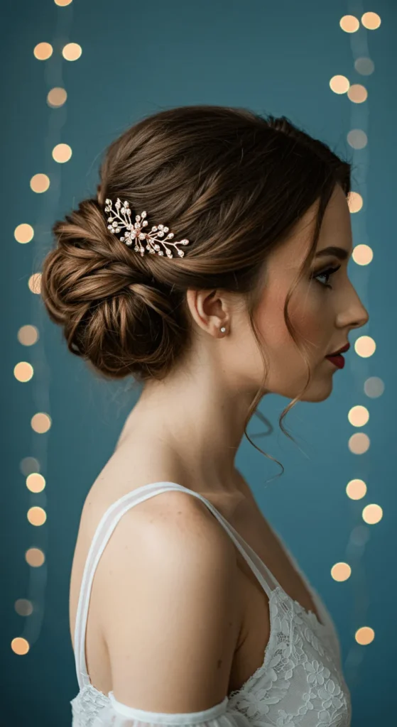 A curly side bun brings both romance and fun. Curl your hair, gather it to one side, and pin loosely. Let a few curls hang free for softness. Add glitter pins or pearls for sparkle. Works beautifully on medium to long hair.