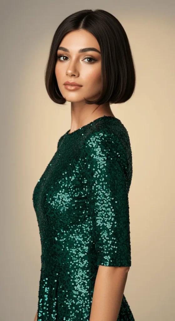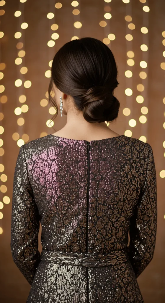 If you have short hair, play with a sleek texture. Straighten your bob and use a shine serum for mirror gloss. Tuck one side behind your ear and add a statement earring. It’s simple, classy, and looks stunning under twinkling lights. Try coconut oil for a budget-friendly shine boost.