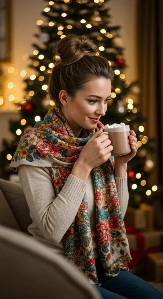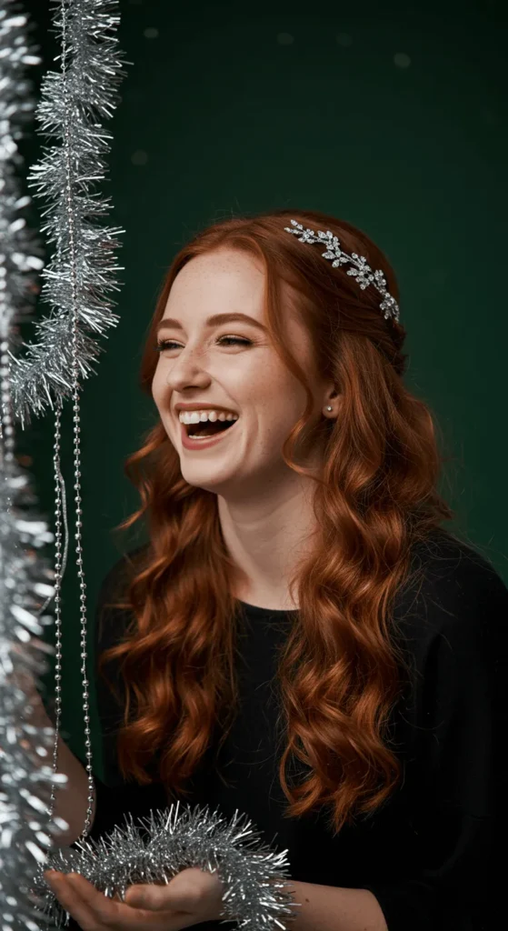 Half-up curls are the sweet spot between casual and chic. Curl your hair in large sections, then gather the top half and secure it with a glitter clip or ribbon. The curls frame your face beautifully and move naturally. For budget-friendly shine, mix a drop of hair oil with water in a spray bottle and lightly mist. You’ll look festive without overdoing it.