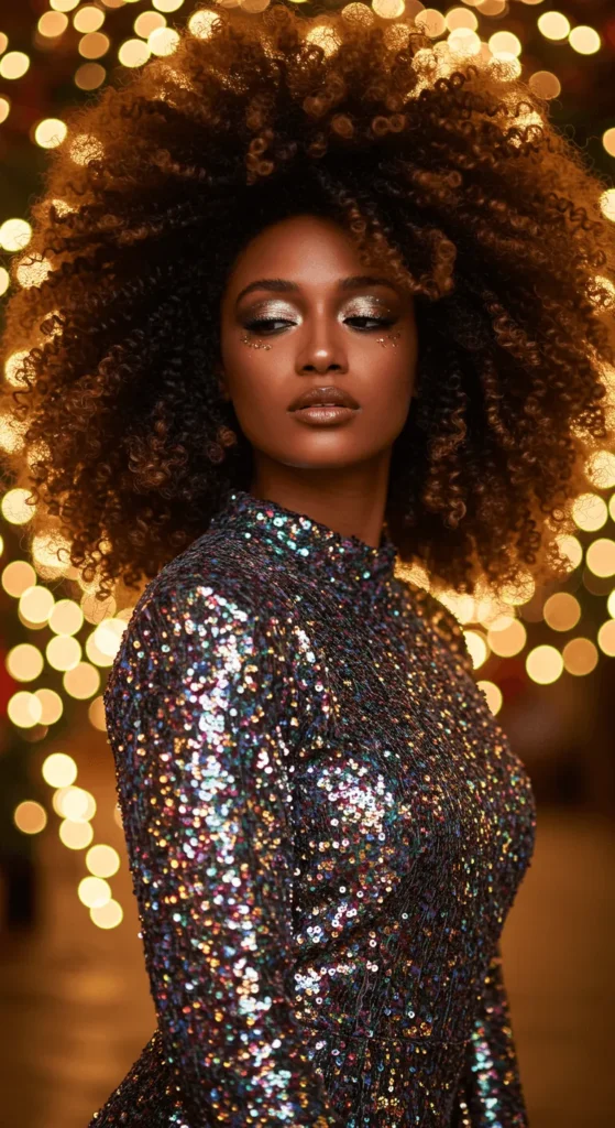 Let your natural curls shine with this statement look. Apply curl cream for definition and pick your roots for volume. Add a clip or sparkle mist for festive flair. It’s bold, confident, and full of personality perfect for the season.