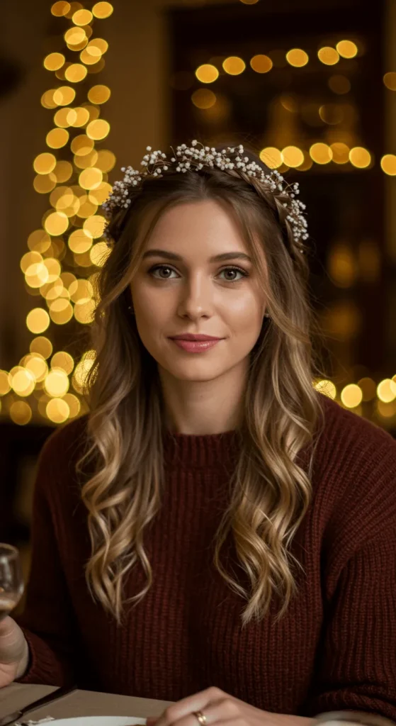The braided crown adds a soft, romantic feel to your holiday look. Part your hair down the middle, create two braids, and wrap them over your head like a crown. Secure with pins and pull gently for volume. You can add tiny pearls or baby’s breath for decoration. It looks fancy but takes just minutes with practice. Ideal for medium to long hair.