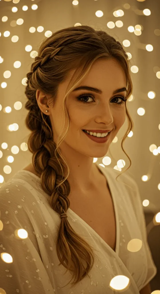 A boho braid feels relaxed but party-ready. Create a side braid, pull sections loose for volume, and tie with a ribbon. Spray a light mist of glitter for extra charm. This works beautifully on second-day hair, saving you styling time. If your hair’s fine, tease the roots before braiding.