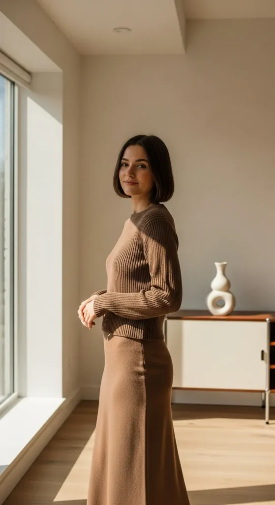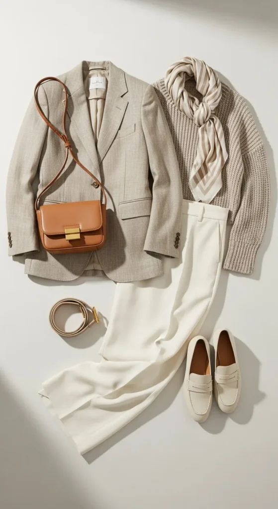 For example, a cream knit sweater paired with tailored cream trousers and a structured coat instantly looks more elevated than three flat cotton pieces.