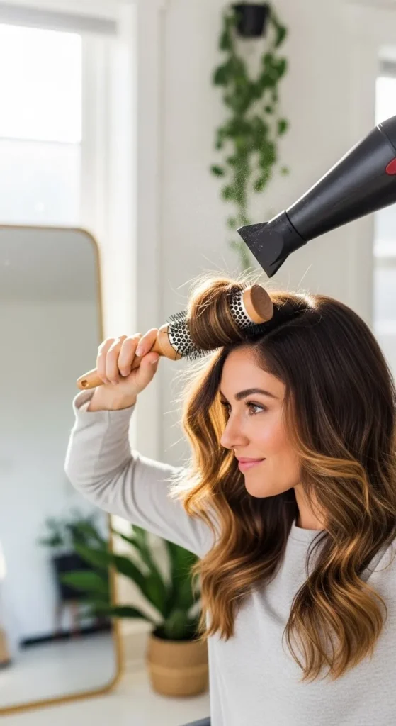 - Blow-dry using a round brush, lifting at the crown.