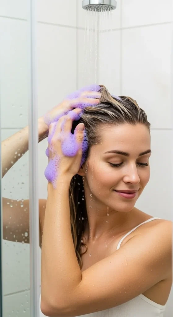 After rinsing out the lightener, use a purple or blue shampoo if your hair looks brassy. Leave it on for 2–3 minutes to neutralize yellow or orange tones.