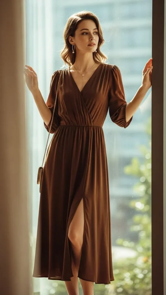 A front slit adds movement and elongates your legs. V-necklines are another subtle trick—they draw attention upward while lengthening the torso.