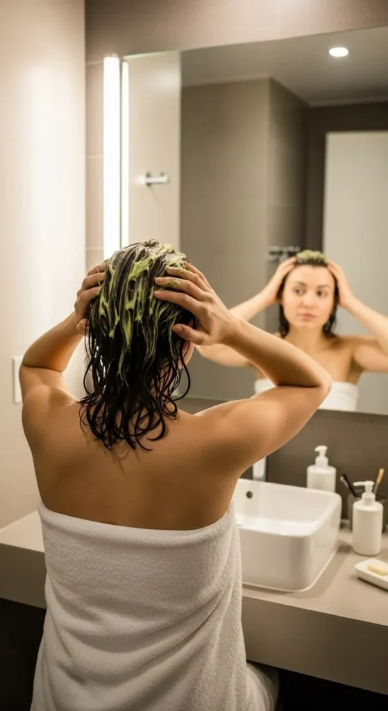 - Massage into your scalp using gentle circular motions for 2–3 minutes.