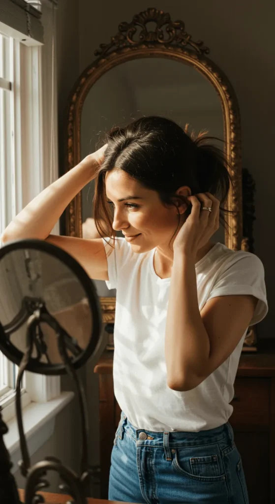 • Optional: Add a cute accessory like a silk scrunchie, pearl pin, or headband for a touch of personality.