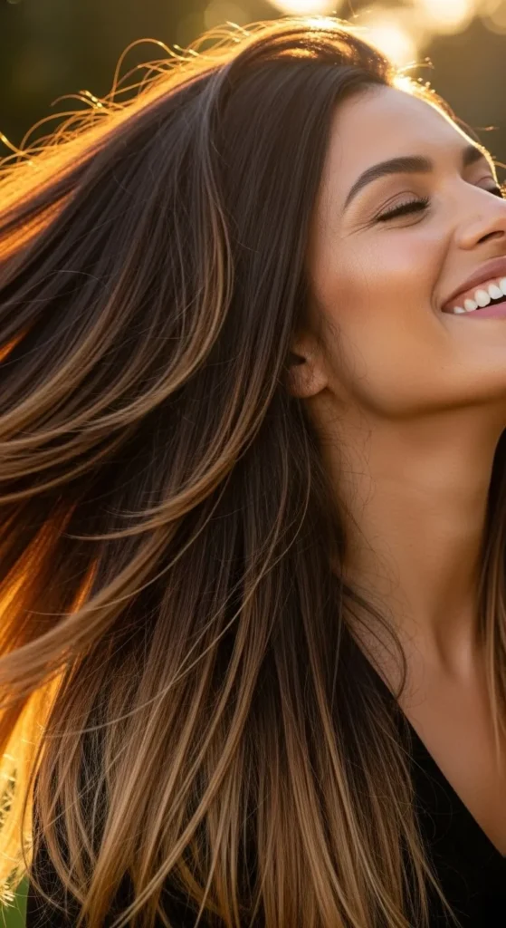 - Dark brown hair: Go for warm caramel, toffee, or chestnut ends.