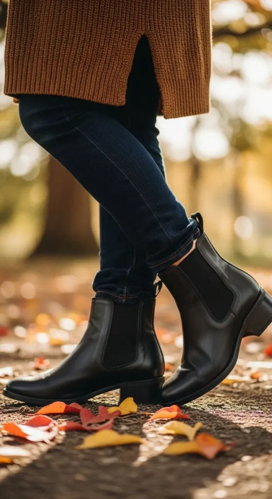 • Cropped jeans + soft cardigan + classic Chelsea boots