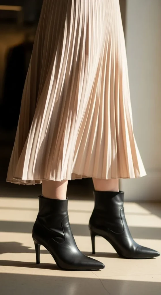 Midi skirts and ankle boots create a polished, elegant look. Focus on matching textures for a cohesive outfit—for example, a satin midi with pointed boots or a knit midi with soft suede. Pleated skirts look especially chic when paired with classic leather boots.
