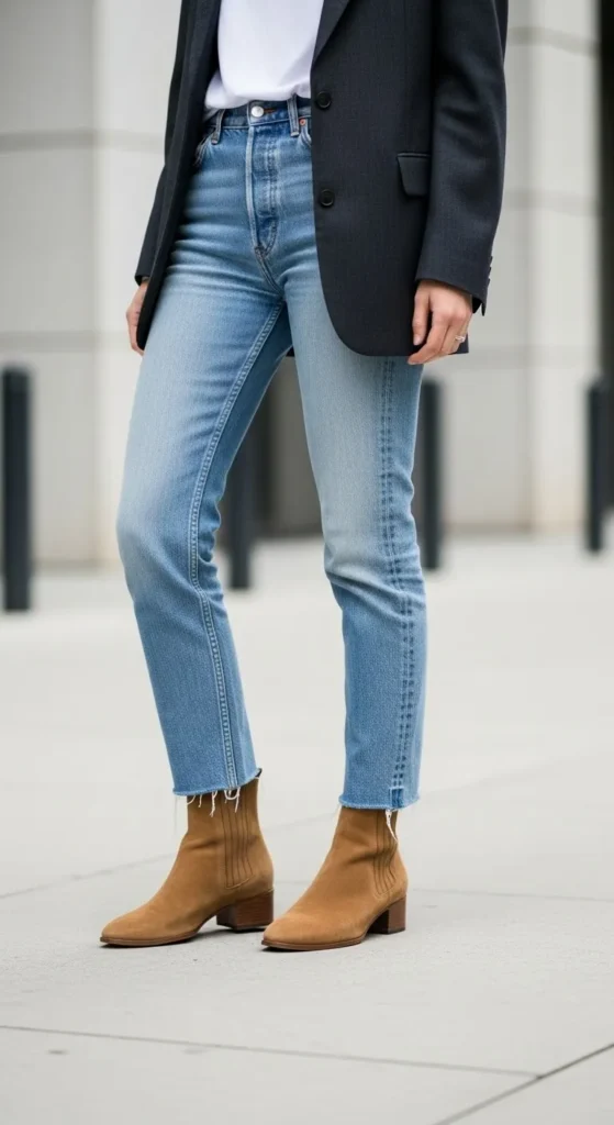 • Straight-leg jeans + white tee + blazer + suede boots