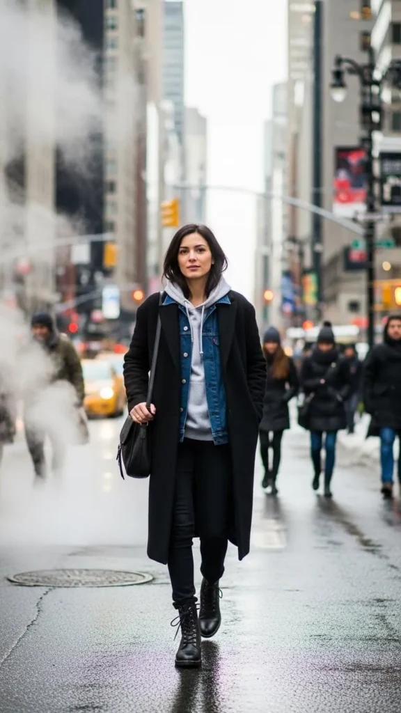 One popular option is wearing a hoodie or fleece-lined sweatshirt under your denim jacket. Another is layering a long wool coat or puffer jacket on top. This creates warmth without sacrificing style.