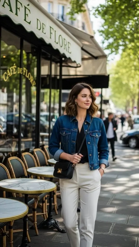 For a polished casual look, pair a dark denim jacket with tailored trousers and a simple blouse. Finish with loafers or ankle boots for a clean, put-together feel.