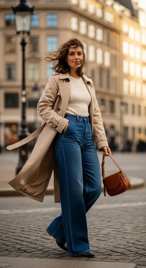 You don’t always need tight pieces—just styles that contrast with the volume of the jeans. Slim-fit tees, fitted turtlenecks, cropped blazers, and crisp button-down shirts all help keep your outfit balanced and modern.