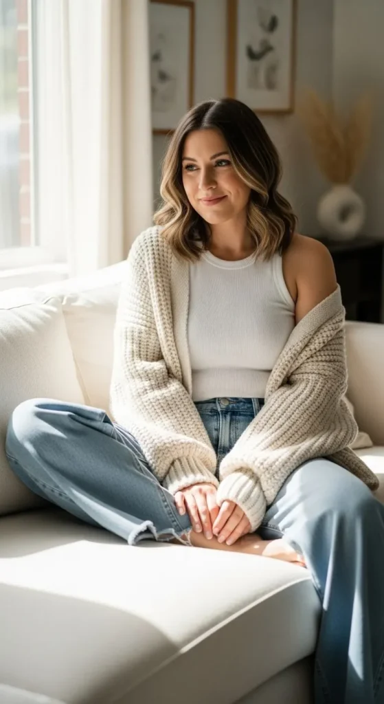 Style light-wash wide-leg jeans with a ribbed tank top, an oversized cardigan, and platform sneakers. This combo feels cozy, effortless, and stylish.