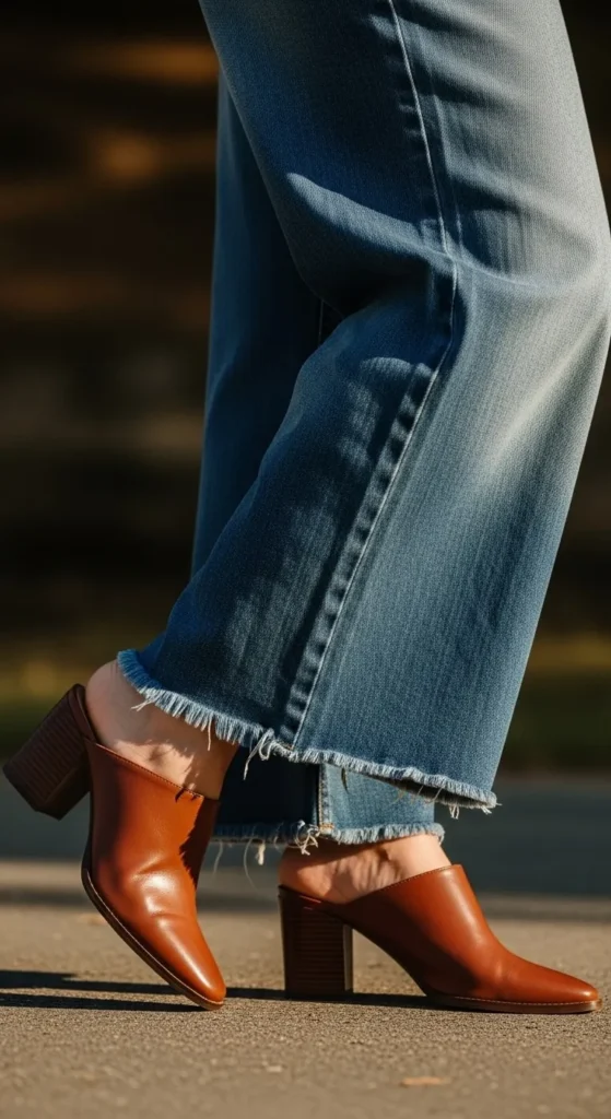 Heels, block heels, wedges, and heeled boots give you instant lift, which helps the jeans drape beautifully. Nude-toned heels can make your legs look even longer. Avoid delicate stiletto heels that may catch on long hems.