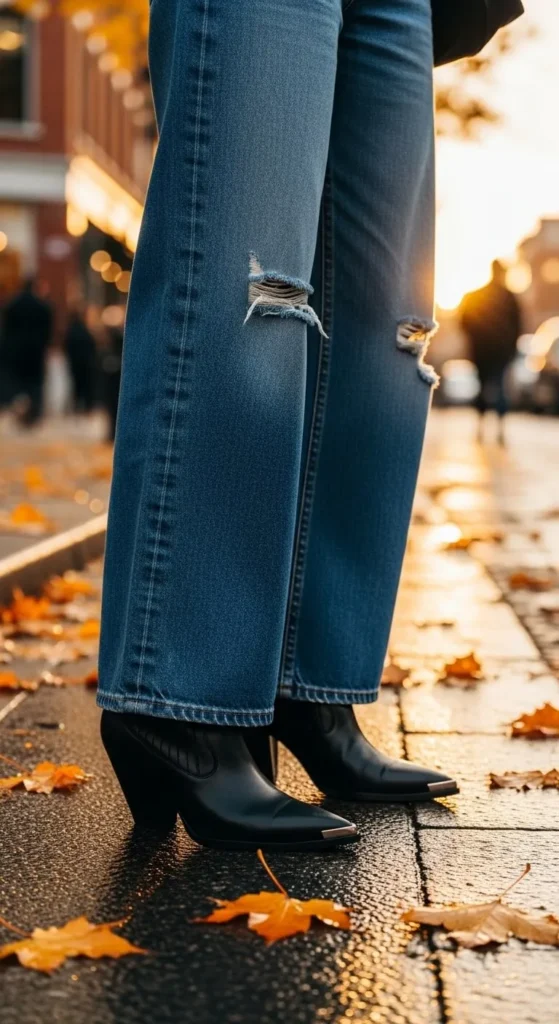 In cooler seasons, wide-leg jeans pair beautifully with ankle boots—especially pointed-toe versions that create a long, uninterrupted line.