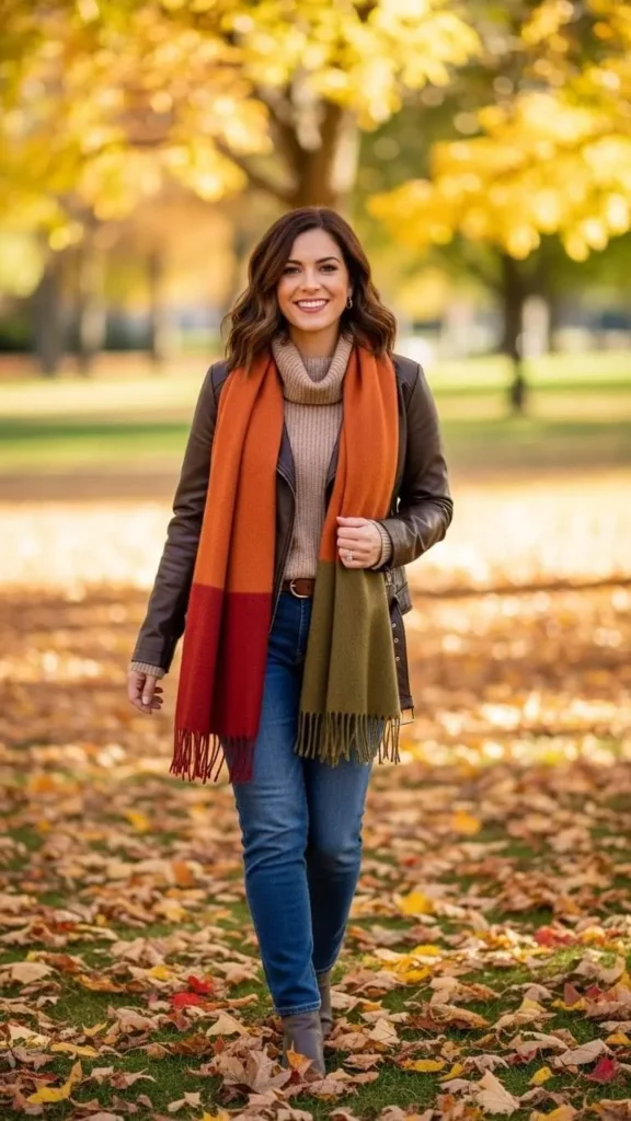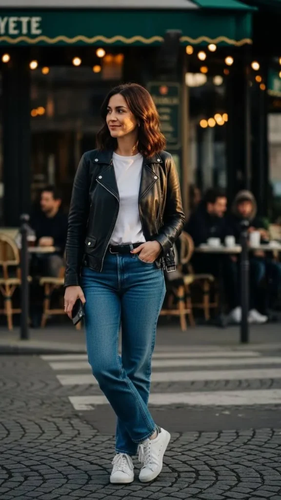 A black or brown leather jacket paired with a basic top and jeans creates an effortless look that feels timeless. This outfit works for running errands, meeting friends, or casual evenings out.