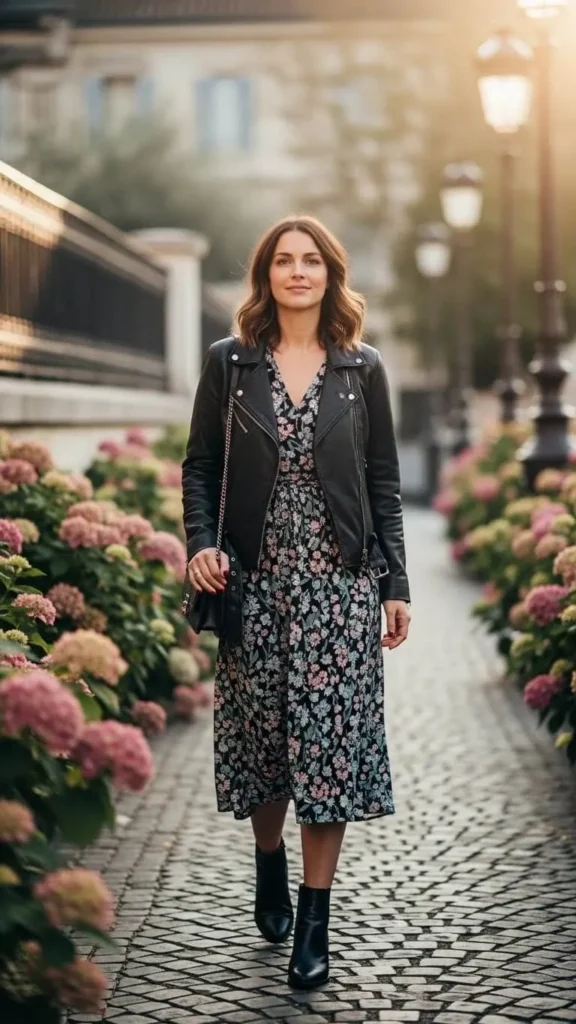One of the most stylish ways to wear a leather jacket is by pairing it with something feminine. The mix of tough and soft creates instant visual interest.