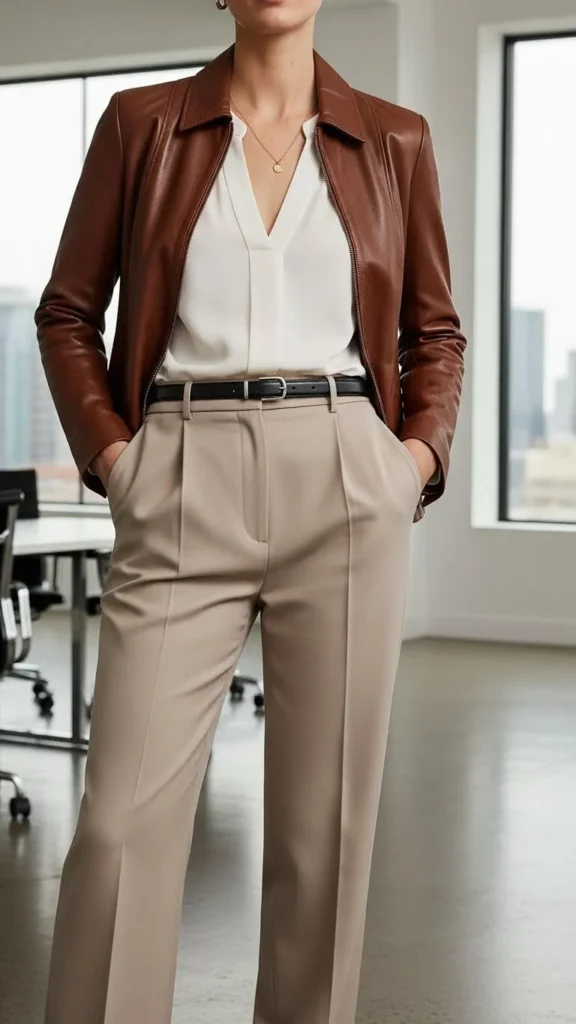 - Leather jacket over a blouse and tailored trousers